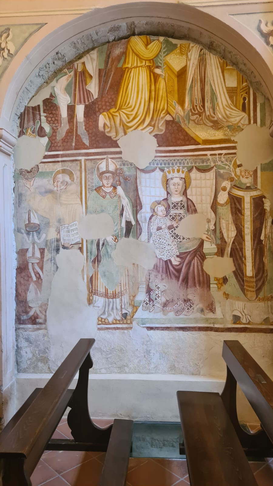 Sulla parete opposta restano decorazioni con motivi floreali e volti di santi, unica traccia dell’antica abside.